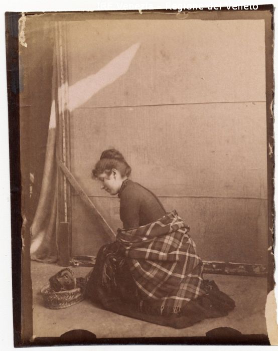 Venezia - Vita veneziana e lagunare - Modelli in posa per scene di genere - Studio su modella - Interno: studio fotografico - Donna: a figura intera, di profilo; inginocchiata - Cestino - Vestiario: scialle di lana a motivo "scozzese"