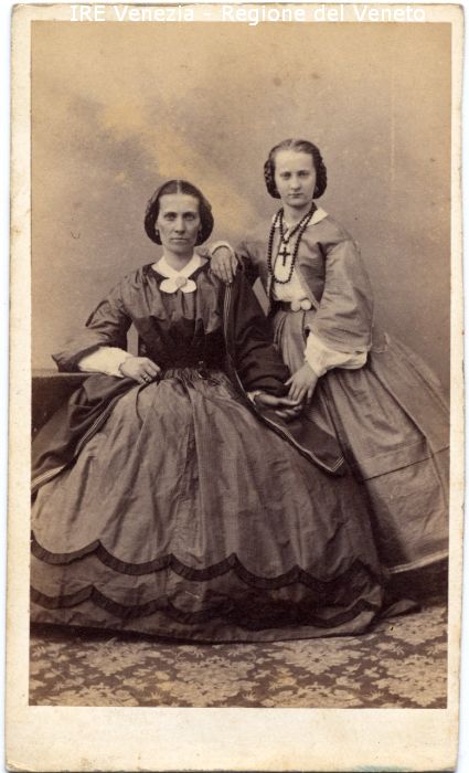 Ritratti: in studio; figura intera; frontale - Donne: due che si tengono per mano - Donna: in piedi - Vestiario: ampio vestito - Gioielli: rosario - Sfondo