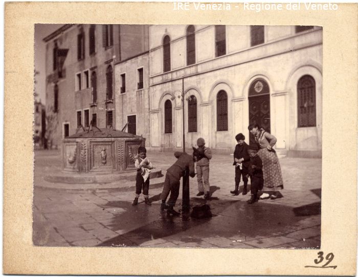 Venezia - Vita veneziana e lagunare - Scene e costumi - Momenti di vita quotidiana - Campo non identificato - Vera da pozzo - Persone: alla fontana - Panni stesi