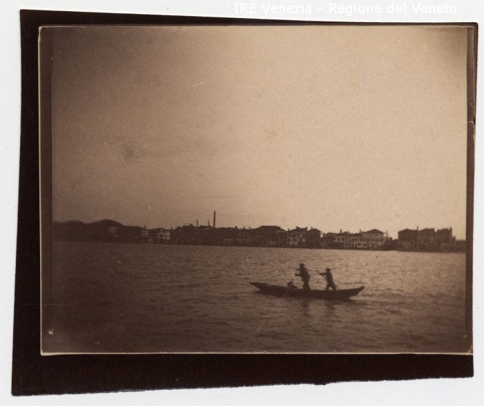 Venezia - Vita veneziana e lagunare - Scene e costumi - Momenti di vita quotidiana - Canale e fondamenta non identificati (Murano?) - Sandolo - Passeggeri - Vogatori