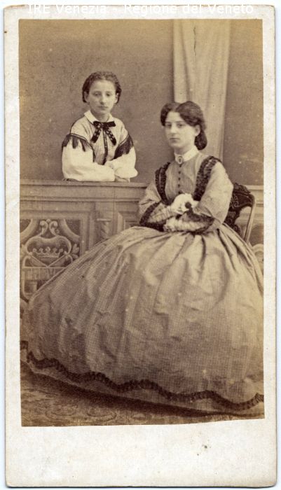 Ritratti: in studio - Donne: due - bambina: in piedi, frontale, appoggiata ad una balaustra, braccia conserte - Vestiario: camicia bianca con frange scure all'altezza delle spalle, fiocco scuro al collo