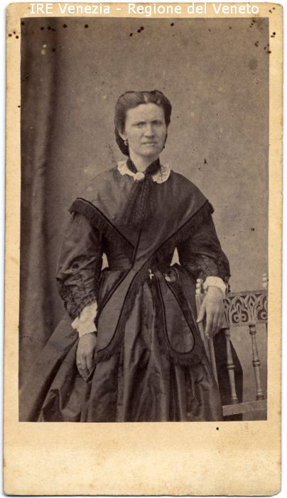 Ritratto: in studio, mezza figura, frontale - Donna: in piedi, con la mano sinistra appoggiata ad una sedia - Vestiario: abito scuro, mantellina con frange, colletto in pizzo bianco, foulard di pizzo nero al collo - Gioielli: orecchini, anello