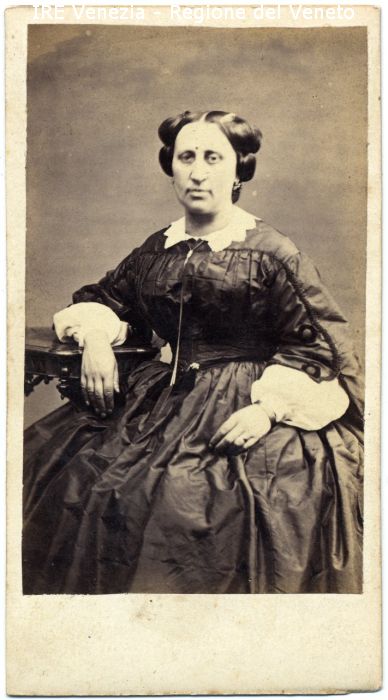 Ritratto: in studio, mezza figura, frontale - Donna: seduta, con il gomito destro appoggiato ad un tavolino - Acconciatura: elaborata, capelli raccolti - Vestiario: abito scuro, colletto bianco - Gioielli: orecchini, collana, bracciale, anello