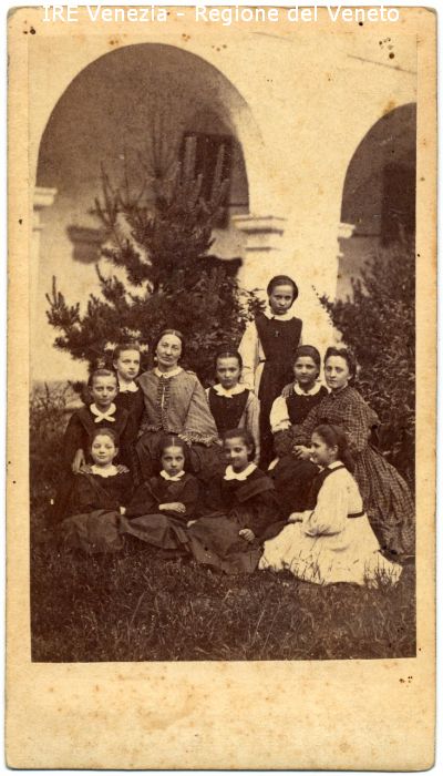 Luigia Manzoni a S. Teonisto - Ritratto: di gruppo, all'aperto, figure intere - Persone: undici, sedute sul prato - Luigia Manzoni: seduta, attorniata dalle allieve - Fondale: cortile del collegio S. Teonisto, portici, prato, pino, alberi