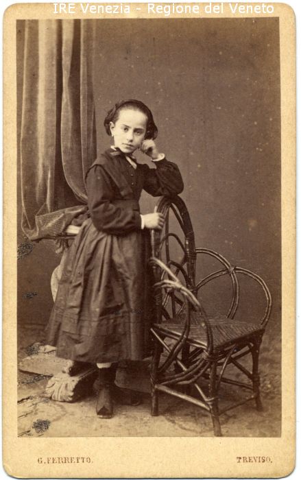 Ritratto di Fausta Alberti - Ritratto: in studio, figura intera, frontale - Bambina: in piedi, appoggiata allo schienale di una poltroncina - Vestiario: abito scuro - Arredamento: poltroncina in vimini, tavolino, tenda - Sfondo