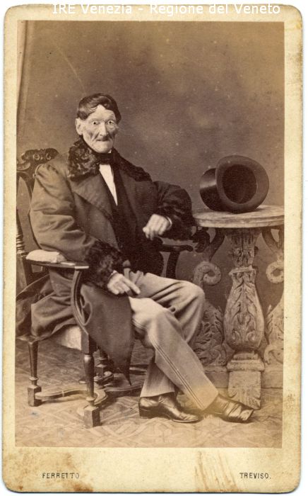 Ritratto: in studio, figura intera, in semi profilo - Uomo: anziano, seduto, gambe incrociate, gomito sinistro appoggiato su un tavolino
