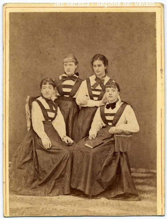 Ritratto: in studio, figure intere, frontali - Donne: quattro - Donna: a sinistra, seduta, con un fiore in mano - Donne: in piedi, a braccetto - Donna: a destra, seduta, con un libro in mano