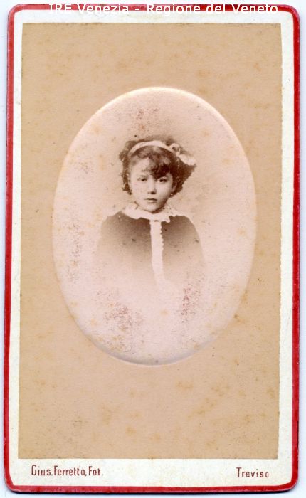 Ritratto: in studio, mezzo busto, frontale - Bambina - Acconciatura: capelli corti, nastrino chiaro - Vestiario: abito scuro, colletto bianco - Gioielli: orecchini - Sfondo