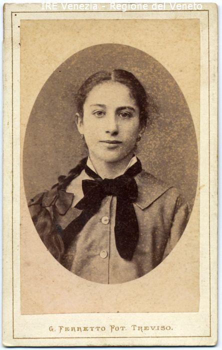Ritratto: in studio, mezzo busto, frontale - Ragazza - Acconciatura: treccia - Vestiario: abito con bottoni, fiocco scuro al collo - Gioielli: orecchini - Sfondo