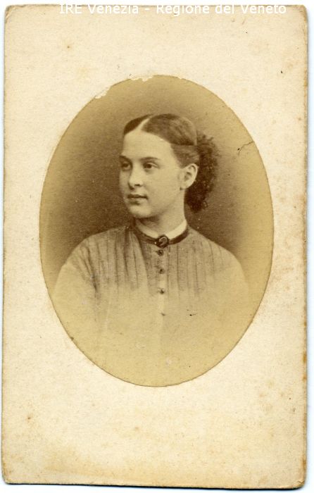 Ritratto di Olga, Regina di Grecia - Ritratto: in studio, mezzo busto, in semi profilo - Donna - Acconciatura: capelli raccolti - Vestiario: abito chiaro, colletto bianco, bottoni - Accessori: spilla - Sfondo