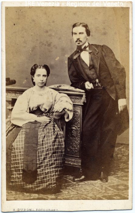 Ritratto: in studio, figure intere, frontali - Uomo: con baffi e pizzetto, in piedi, appoggiato ad un mobile - Vestiario: giacca e pantaloni scuri, gilét, camicia bianca, cravattino - Donna: seduta - Vestiario: gonna a quadri, camicia chiara