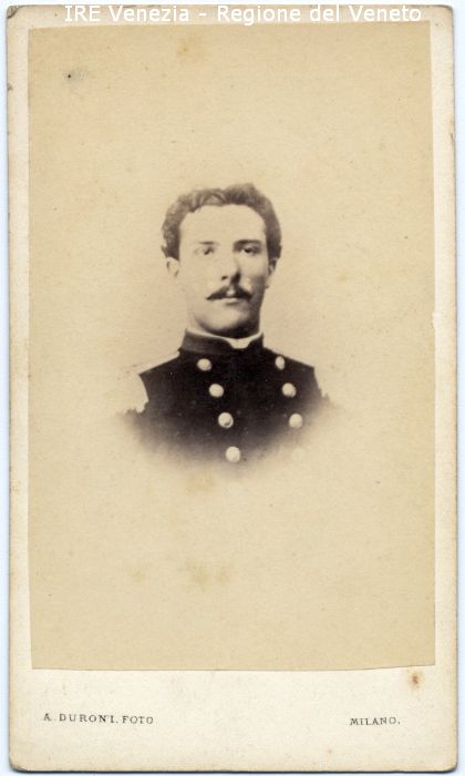 Ritratto: in studio, mezzo busto, frontale - Uomo: con baffi - Vestiario: uniforme militare, bottoni - Sfondo