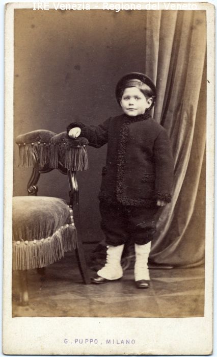 Ritratto: in studio, figura intera, frontale - Bambino: in piedi, appoggiato allo schienale di una poltroncina - Vestiario: giacca scura, copriscarpe bianchi, cappello - Arredamento: poltroncina in legno imbottita, frange, tenda