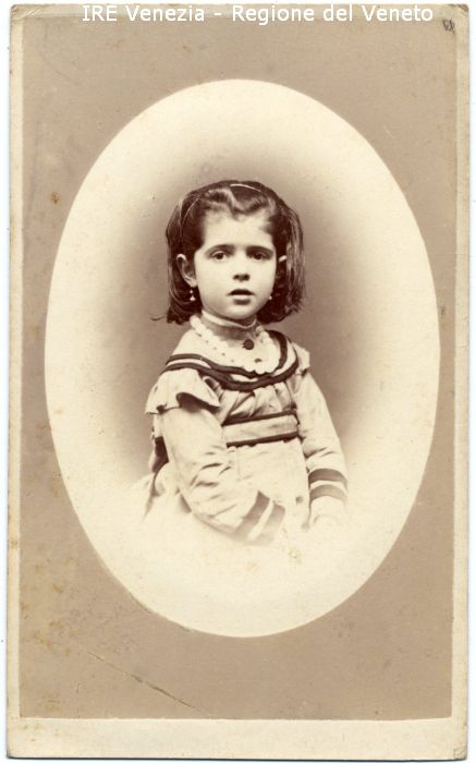Ritratto: in studio, mezzo busto, frontale - Bambina - Vestiario: abito chiaro con voulan - Gioielli: orecchini pendenti, collana con perle bianche - Sfondo