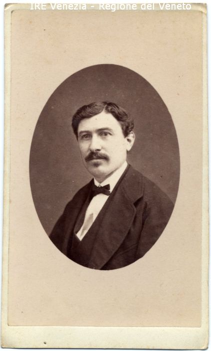 Ritratto: in studio, mezzo busto, in semi profilo - Uomo: con baffi e mosca - Vestiario: giacca scura, gilét, camicia bianca, cravattino - Sfondo