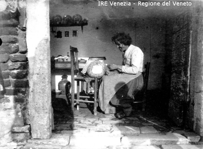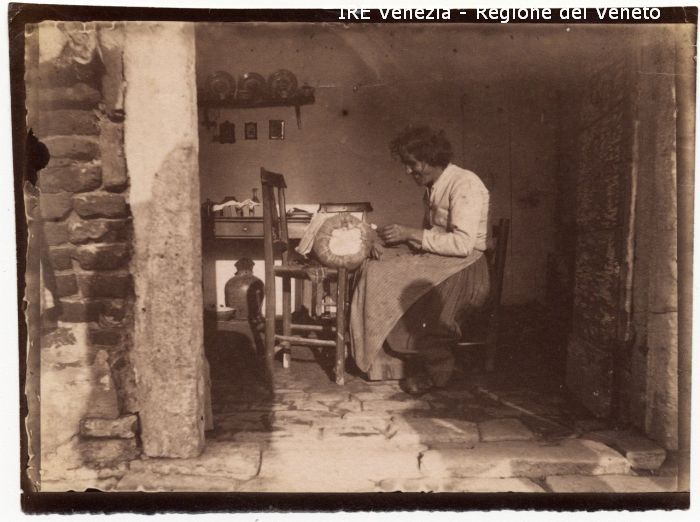 Venezia - Vita veneziana e lagunare - Scene e costumi - Produzione di merletti - Località non identificata (Murano ?) - Ingresso di abitazione - Merlettaia - Donna: al tombolo - Sullo sfondo: arredo interno