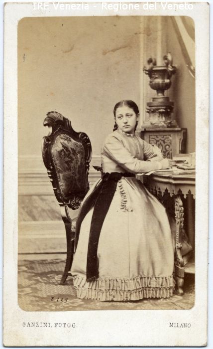 Ritratto: in studio, figura intera, frontale - Donna: seduta, alla scrivania - Acconciatura: trecce - Vestiario: abito chiaro, fascia nera in vita - Gioielli: orecchini