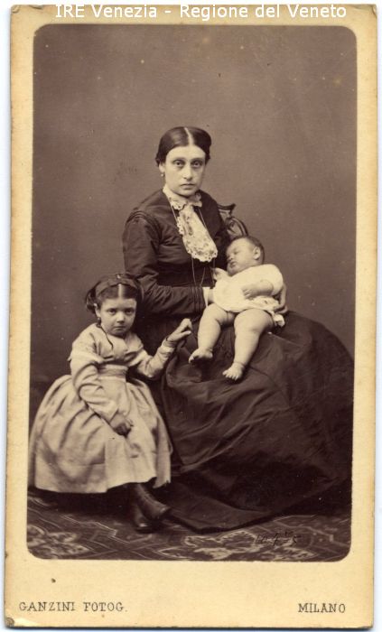 Ritratto: in studio, figure intere, frontali - Donna: seduta, con bambino neonato in braccio - Vestiario: abito scuro, colletto bianco in pizzo - Gioielli: orecchini - Bambino: neonato, in braccio alla madre, dorme - Bambina: seduta, gambe incrociate
