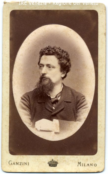 Ritratto: in studio, mezzo busto, in semi profilo - Uomo: con baffi e barba, braccia conserte - Vestiario: giacca scura, camicia bianca, cravatta - Sfondo