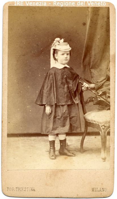 Ritratto: in studio, figura intera, in semi profilo - Bambina: in piedi, appoggiata allo schienale di una sedia, con un ombrellino in mano - Vestiario: abito scuro con mantellina, colletto bianco, stivaletti, cappello - Gioielli: orecchini