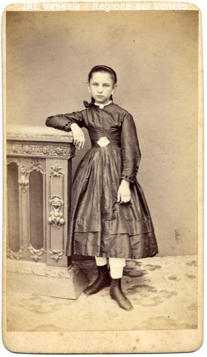 Ritratto: in studio, figura intera, frontale - Ragazza: in piedi, appoggiata ad una balaustra - Vestiario: abito scuro, colletto bianco, stivaletti, fibbia all'altezza della vita - Gioielli: orecchini - Arredamento: balaustra intarsiata - Sfondo