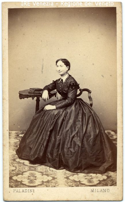 Ritratto: in studio, figura intera, in semi profilo - Donna: seduta, braccio destro appoggiato ad un tavolino - Vestiario: abito scuro, bottoni, gonna ampia, colletto bianco - Gioielli: orecchini, lunga collana