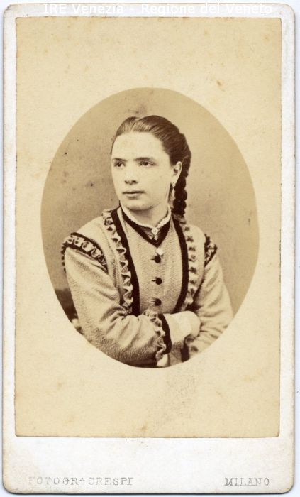 Ritratto: in studio, mezzo busto, in semi profilo - Ragazza: braccia conserte - Acconciatura: trecce - Vestiario: abito chiaro, bordature scure con voulan, bottoni - Gioielli: orecchini pendenti, spilla, collana con ciondolo - Sfondo