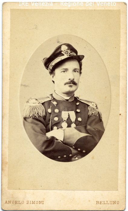 Ritratto del Luogotenente Ernesto Vignoni - Ritratto: in studio, mezzo busto, frontale - Uomo: con baffi e mosca, braccia conserte - Vestiario: uniforme militare, bersagliere, medaglie, berretto - Sfondo