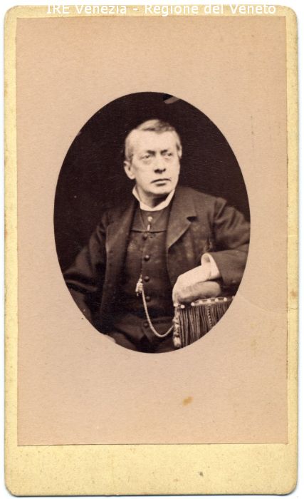 Ritratto: in studio, mezzo busto, frontale - Uomo: seduto - Vestiario: giacca scura, gilét, bottoni, camicia bianca - Arredamento: sedia con frange - Sfondo