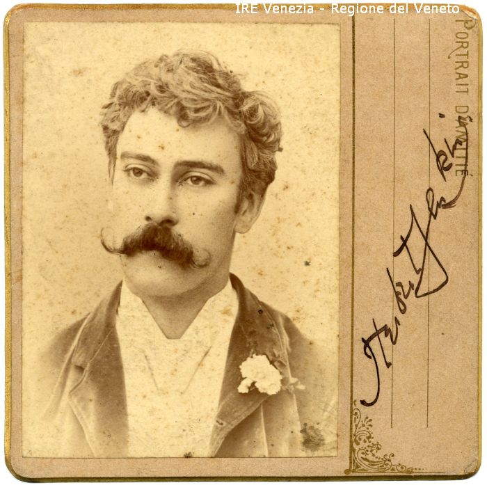 Ritratto: in studio, mezzo busto, frontale - Uomo: giovane, con baffi - Vestiario: giacca scura, camicia bianca, fiore all'occhiello: garofano bianco - Sfondo