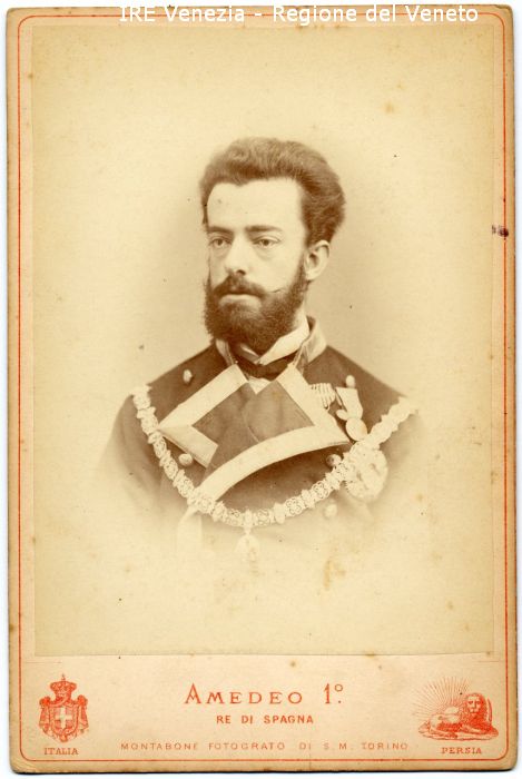 Ritratto di Amedeo di Savoia Re di Spagna - Ritratto: in studio, mezzo busto, in semi profilo - Uomo: con baffi e barba - Vestiario: giacca, bottoni, camicia bianca, cravattino, medaglie - Sfondo
