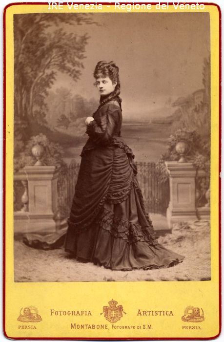 Ritratto: in studio, figura intera, in semi profilo - Donna: in piedi - Vestiario: abito scuro, voulan, strascico - Fondale: trompe l'oeil: paesaggio, balaustra, terrazzo, inferriata, piante, alberi, lago