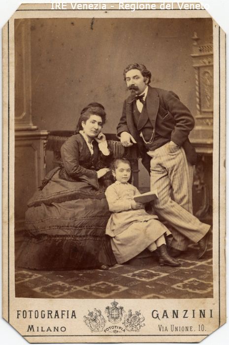 Uomo: con baffi e pizzetto, in piedi, mano in tasca, gambe incrociate - Vestiario: pantaloni a righe, giacca, gilét, camicia, cravattino - Bambina: seduta, libro in mano - Arredamento: mobili, tappeto