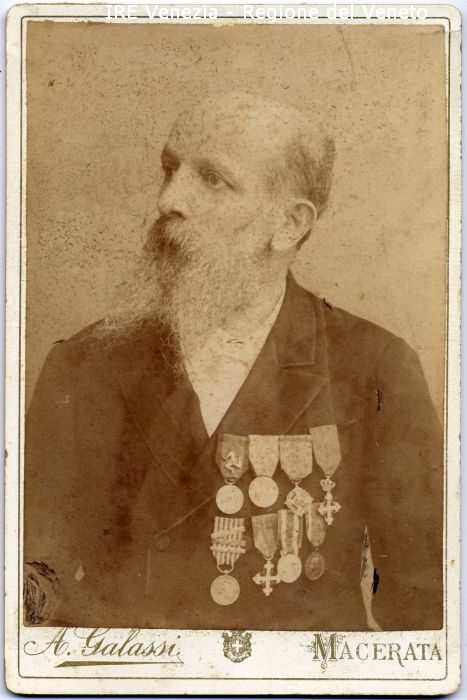 Ritratto: in studio, mezzo busto, in semi profilo - Uomo: con baffi e barba bianchi - Vestiario: giacca, camicia bianca - Medaglie: otto, appuntate sul petto, croce, corona - Sfondo