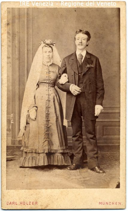 Ritratti: in studio, figure intere, frontali - Sposi: a braccetto - Donna: abito con voulan, bottoni, velo lungo in testa, fiori - Uomo: abito elegante, cravatta, fiore all'occhiello - Fondale: interno di una stanza, zoccolo