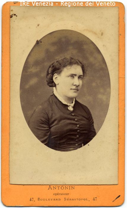 Ritratto: in studio, mezzo busto, in semi profilo - Donna - Vestiario: abito scuro, bottoni, colletto bianco - Gioielli: orecchini, spilla cammeo - Sfondo