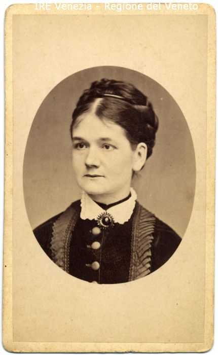 Ritratto di una maestra - Ritratto: in studio, mezzo busto, in semi profilo - Donna - Acconciatura: capelli raccolti, treccia, cerchiello - Vestiario: abito scuro, bottoni, colletto bianco - Gioielli: spilla - Sfondo