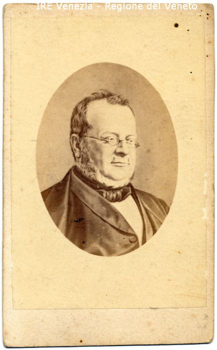 Ritratto di Cavour - Ritratto: pittorico ?, mezzo busto, in semi profilo - Uomo: con barba e occhiali - Vestiario: giacca, camicia bianca, papillon - Sfondo