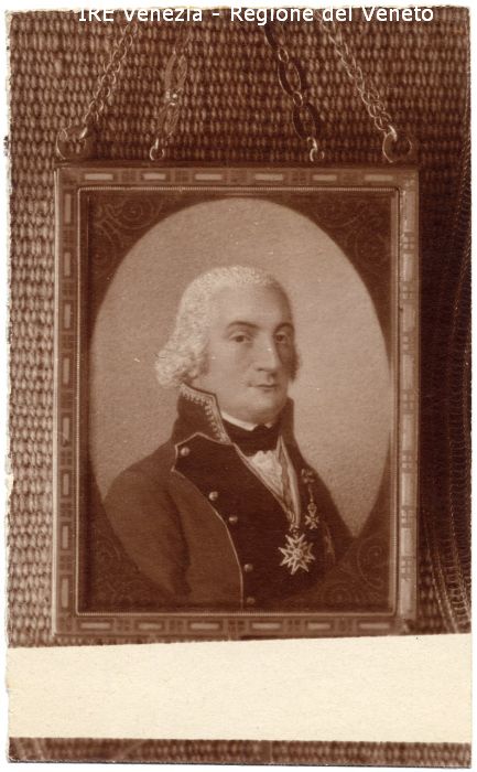 Ritratto: da un quadro, mezzo busto, in semi profilo - Uomo - Vestiario: giacca, camicia, croce di Malta - Sfondo