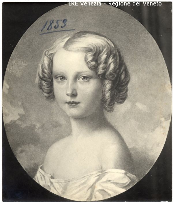 Ritratto della Principessa Borghese - Ritratto: da un dipinto, mezzo busto, in semi profilo - Bambina - Acconciatura: boccoli - Vestiario: abito bianco, spalle scoperte - Sfondo