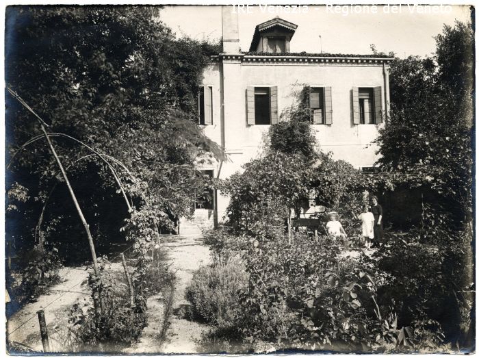 Comm. Fradeletto, sua casa all'Angelo Raffaele - Venezia: casa, giardino - Persone: tre, una donna e due bambine, in giardino