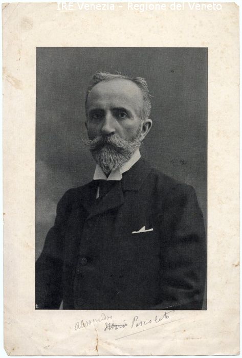 Alessandro Pascolato - Ritratto: in studio, mezzo busto, frontale - Uomo: con baffi e barba grigi - Vestiario: giacca, camicia, cravatta - Sfondo