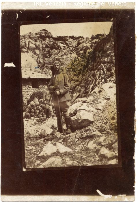 Conte Elti di Rodeano - Ritratto: all'esterno, figura intera, frontale - Ragazzo: in piedi, bastone in mano - Vestiario: uniforme militare, stivali - Fondale: montagne, rocce, bivacco, sacchi di sabbia