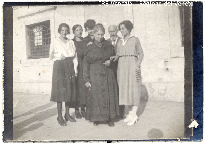 Famiglia Morosini - Ritratti: di gruppo, all'esterno, figure intere - Persone: sei, cinque donne, un uomo, in piedi - Fondale: esterno di un edificio, finestre, inferriata