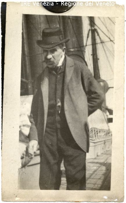 Ratti - Ritratto: all'esterno, mezza figura, in semi profilo - Uomo: con baffi, mano dietro la schiena - Vestiario: giacca, gilét, cravatta, cappello
