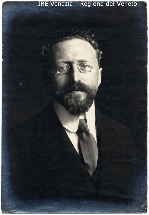 Gino Fogolari - Ritratto: in studio, mezzo busto, frontale - Uomo: con baffi e barba, occhiali pince-nez - Vestiario: giacca, camicia, cravatta - Sfondo