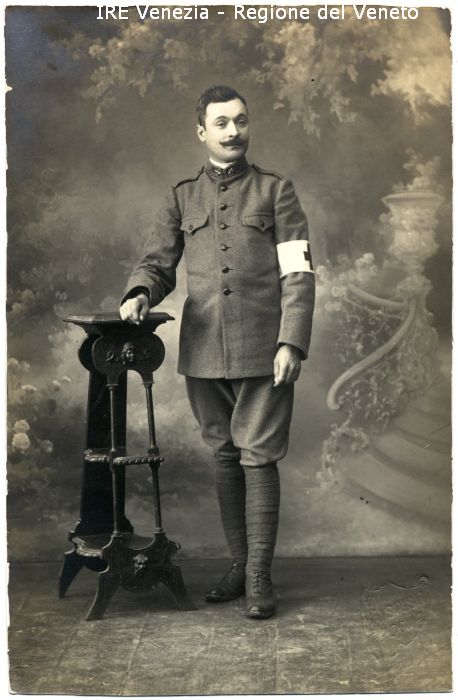 Bassan - Ritratto: in studio, figura intera, in semi profilo - Uomo: con baffi, in piedi - Vestiario: uniforme militare, croce rossa - Arredamento: mobile in legno intarsiato - Fondale dipinto: scalinata, corrimano, vaso, piante, nuvole, rose