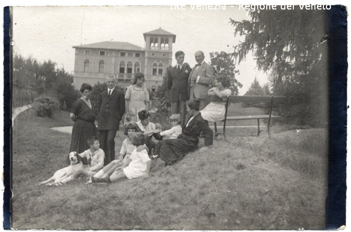 Prof. Molon - Ritratti: di gruppo, all'esterno, figure intere - Persone: dodici, tre uomini, cinque donne, quattro bambini, un cane - Fondale: giardino, collina, alberi, pino, panchina, palazzo - Lido di Venezia
