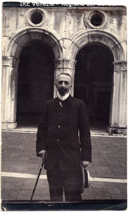 Ritratto del dott. R. Dratti - Ritratto: all'esterno, mezza figura, frontale - Uomo: con baffi e pizzetto, bastone, cappello - Vestiario: giacca, camicia, cravatta - Cortile interno di Palazzo Ducale