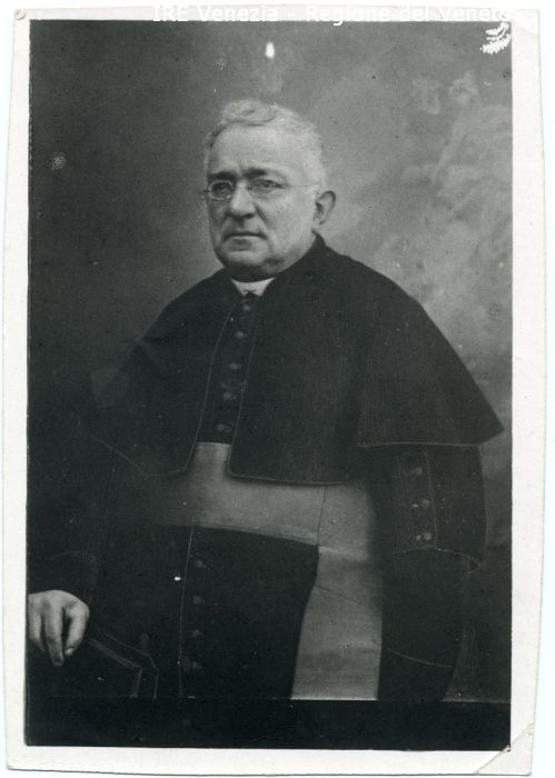 Don Vason - Ritratto: in studio, mezza figura, in semi profilo - Uomo: con occhiali - Vestiario: abito da sacerdote, mantellina, fascia - Sfondo